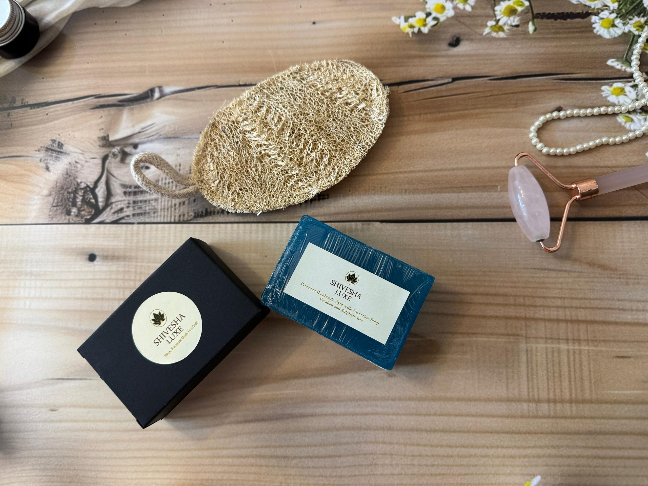 “Indulge in a luxurious bathing ritual with Shivesha Luxe’s handcrafted Ayurvedic glycerine soaps, made using traditional Kerala herbs and pure skin-loving ingredients. This premium trio includes three refreshing variants — Pure Orange, Mogra, and Morning Mist — each offering a gentle, hydrating cleanse with a soft, creamy lather. Completely free from sulphates and parabens, these soaps keep your skin nourished, fresh, and lightly fragrant all day long. The combo is beautifully complemented with a pure jute, sun-dried natural loofah that enhances exfoliation while remaining gentle on the skin. A perfect blend of purity, craftsmanship, and everyday luxury.”