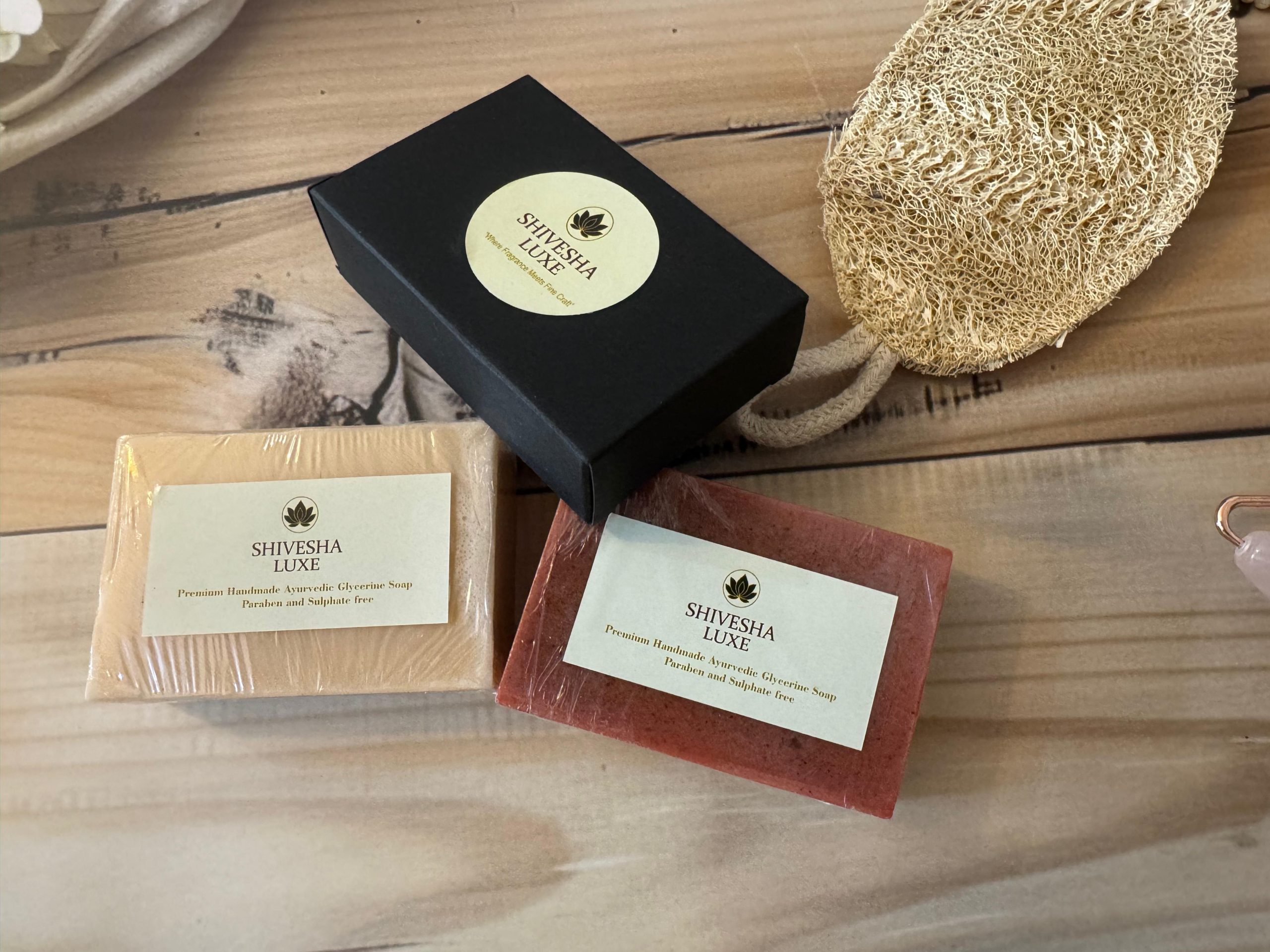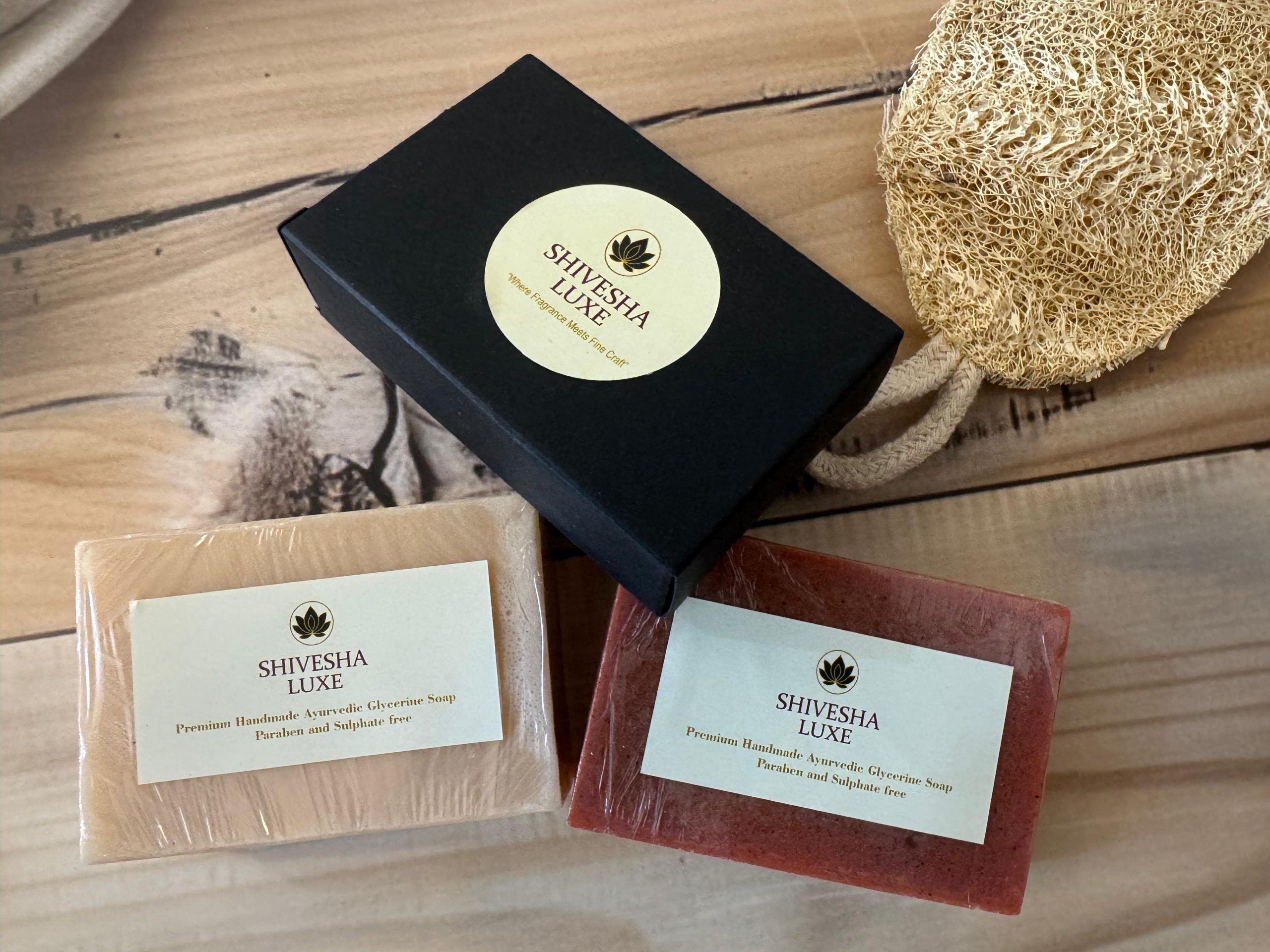 “Indulge in a luxurious bathing ritual with Shivesha Luxe’s handcrafted Ayurvedic glycerine soaps, made using traditional Kerala herbs and pure skin-loving ingredients. This premium trio includes three refreshing variants — Pure Orange, Mogra, and Morning Mist — each offering a gentle, hydrating cleanse with a soft, creamy lather. Completely free from sulphates and parabens, these soaps keep your skin nourished, fresh, and lightly fragrant all day long. The combo is beautifully complemented with a pure jute, sun-dried natural loofah that enhances exfoliation while remaining gentle on the skin. A perfect blend of purity, craftsmanship, and everyday luxury.”