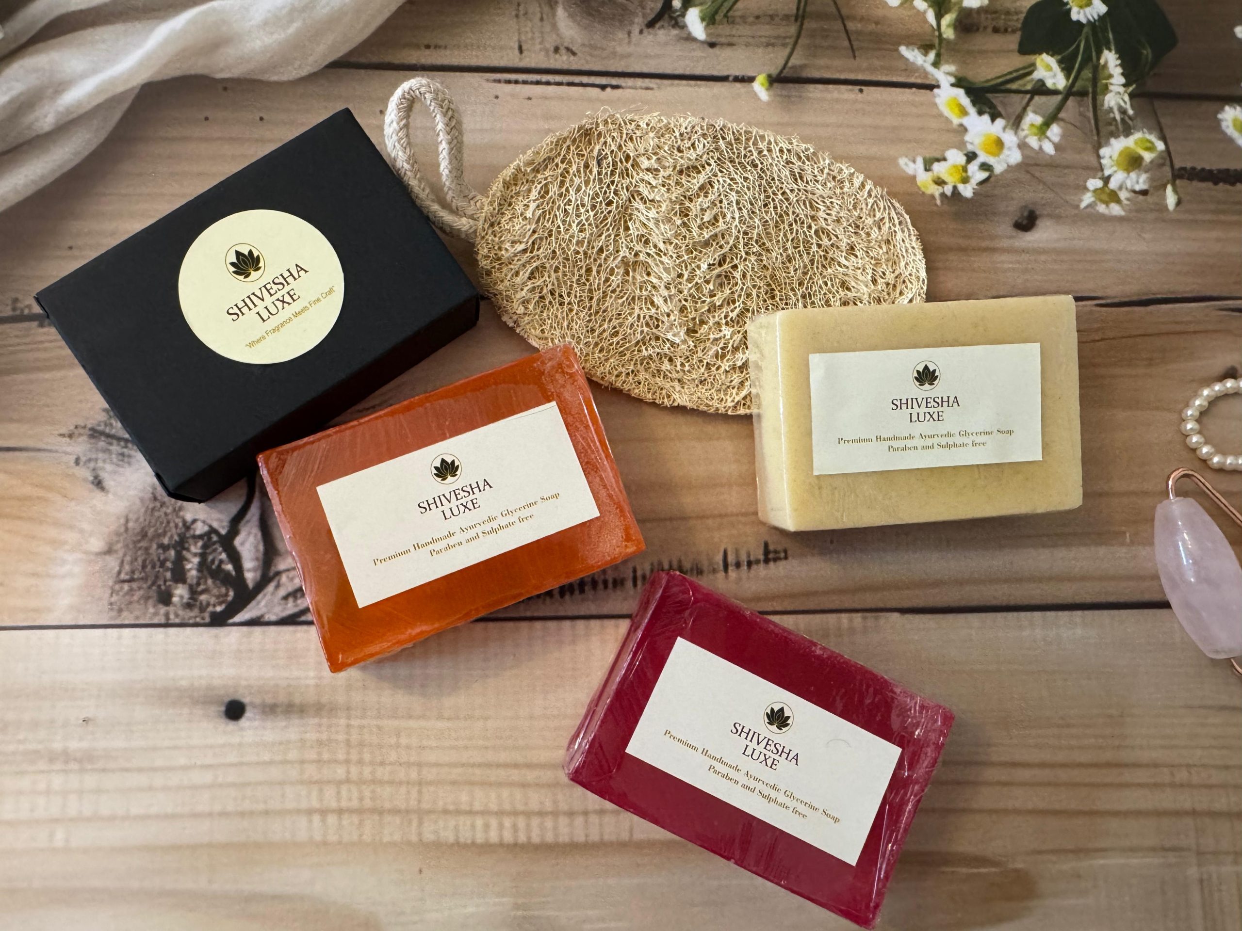 “Indulge in a luxurious bathing ritual with Shivesha Luxe’s handcrafted Ayurvedic glycerine soaps, made using traditional Kerala herbs and pure skin-loving ingredients. This premium trio includes three refreshing variants — Pure Orange, Mogra, and Cream Soft — each offering a gentle, hydrating cleanse with a soft, creamy lather. Completely free from sulphates and parabens, these soaps keep your skin nourished, fresh, and lightly fragrant all day long. The combo is beautifully complemented with a pure jute, sun-dried natural loofah that enhances exfoliation while remaining gentle on the skin. A perfect blend of purity, craftsmanship, and everyday luxury.”