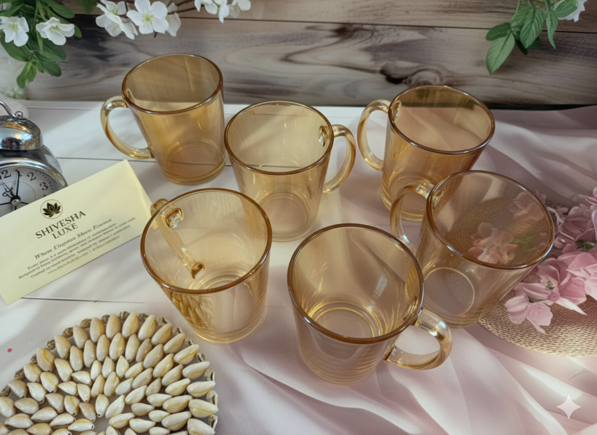 Made from premium, heat-resistant glass, each cup feels feather-light yet durable, making them ideal for daily use as well as elegant hosting. Their dual-tone golden shine instantly elevates your table, tray, or home café setup with a soft, modern warmth.